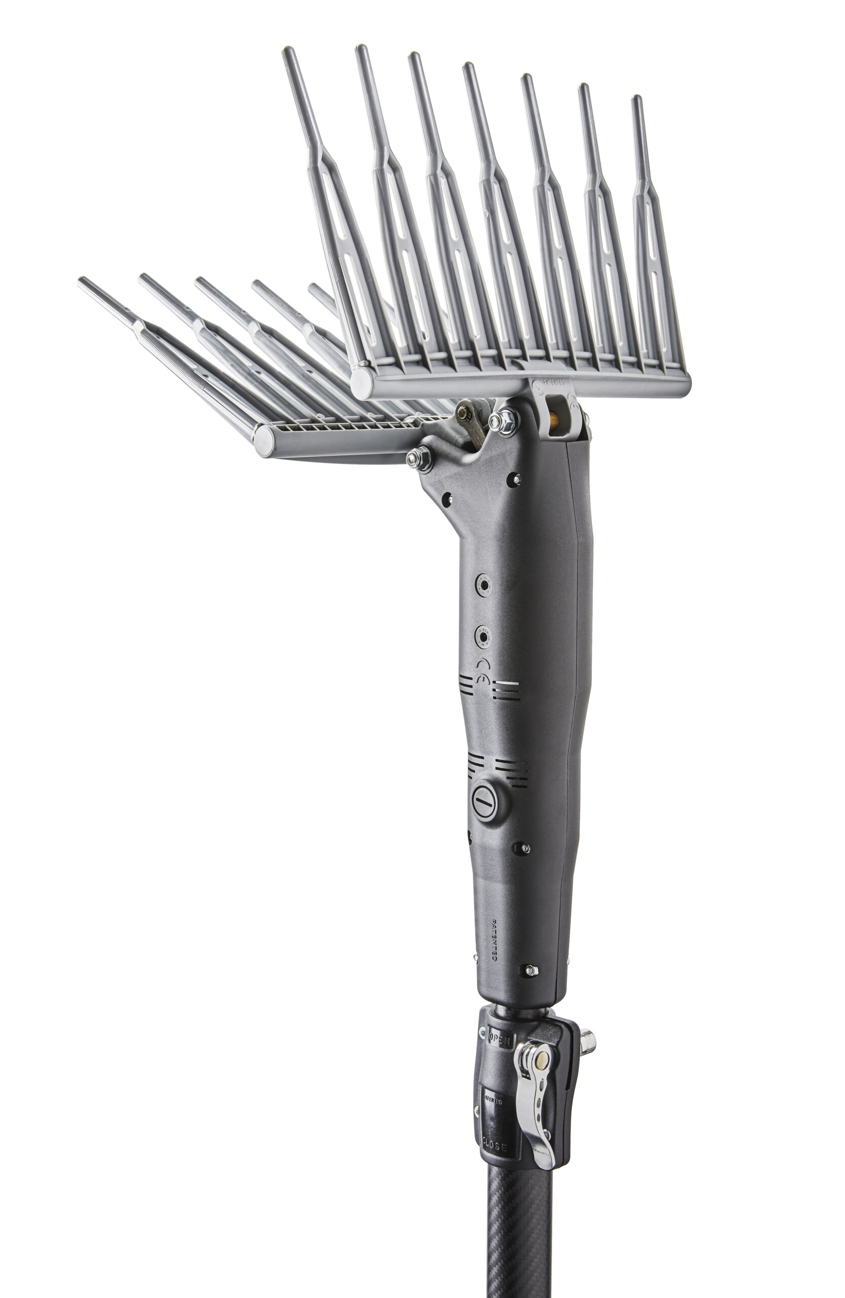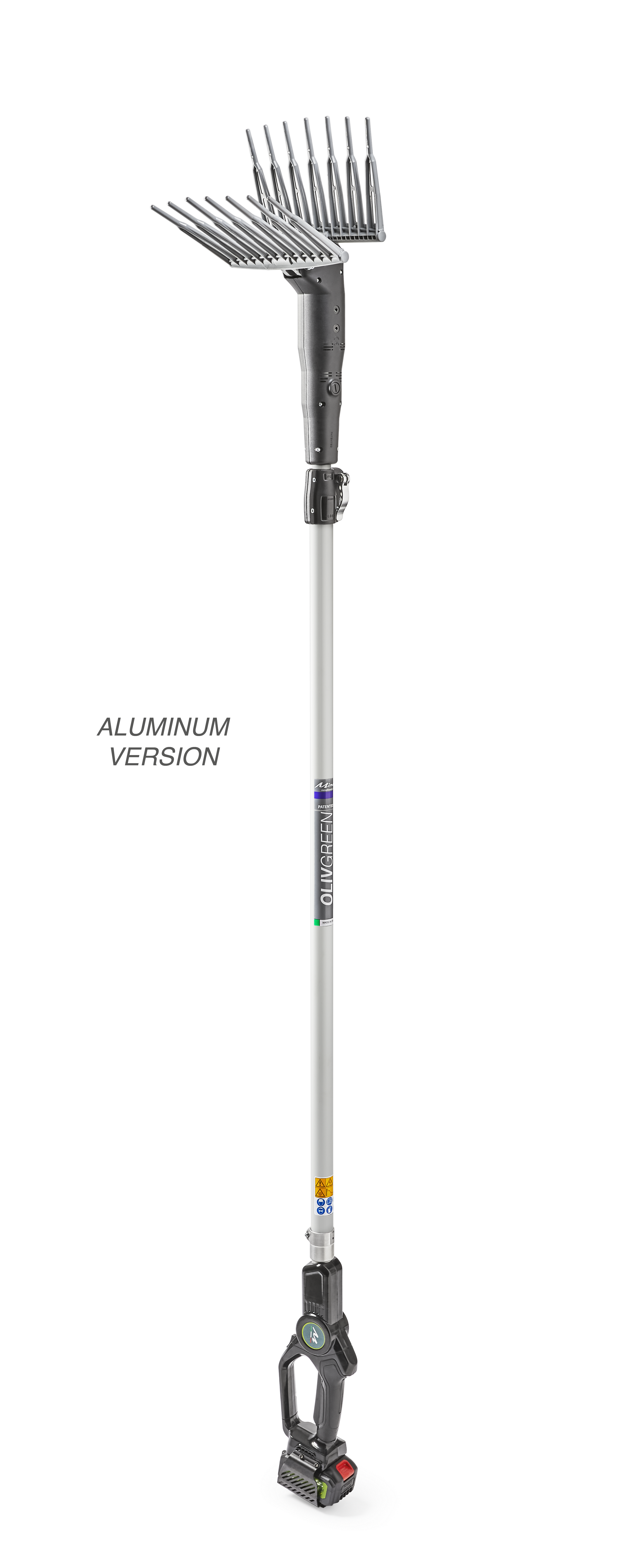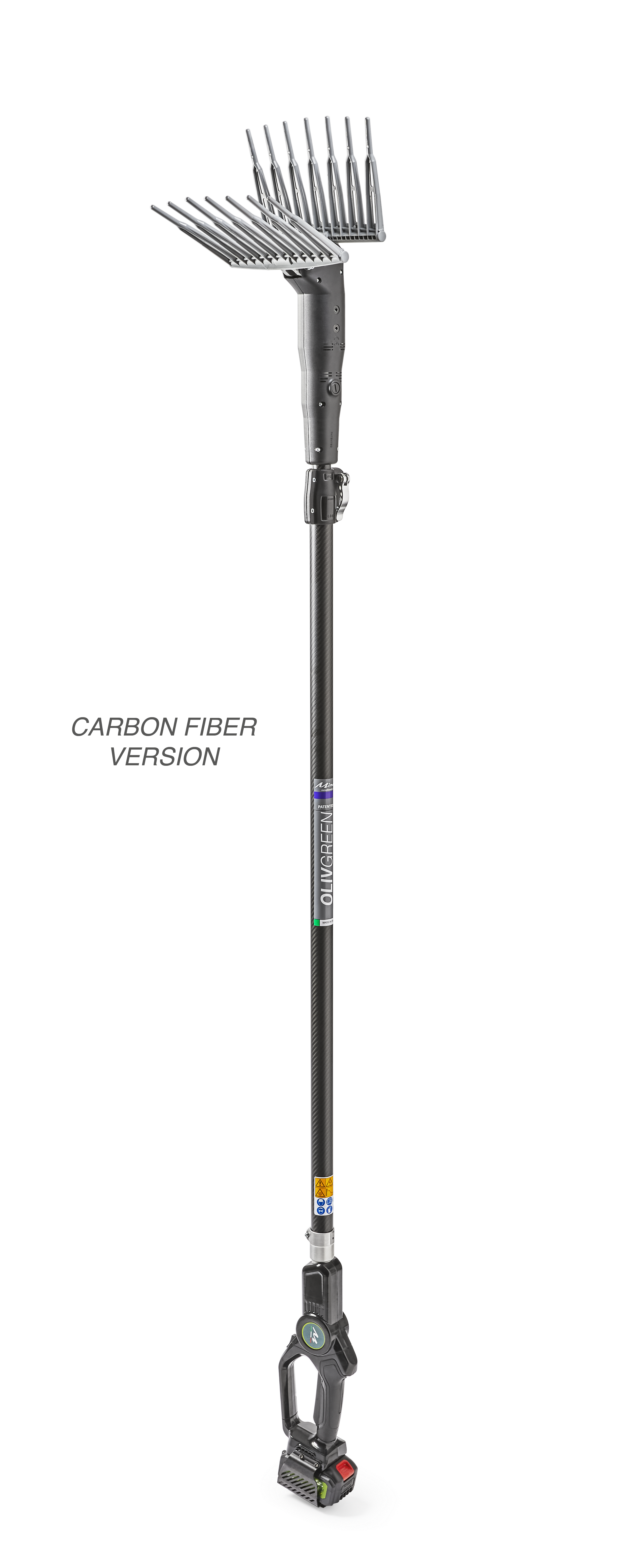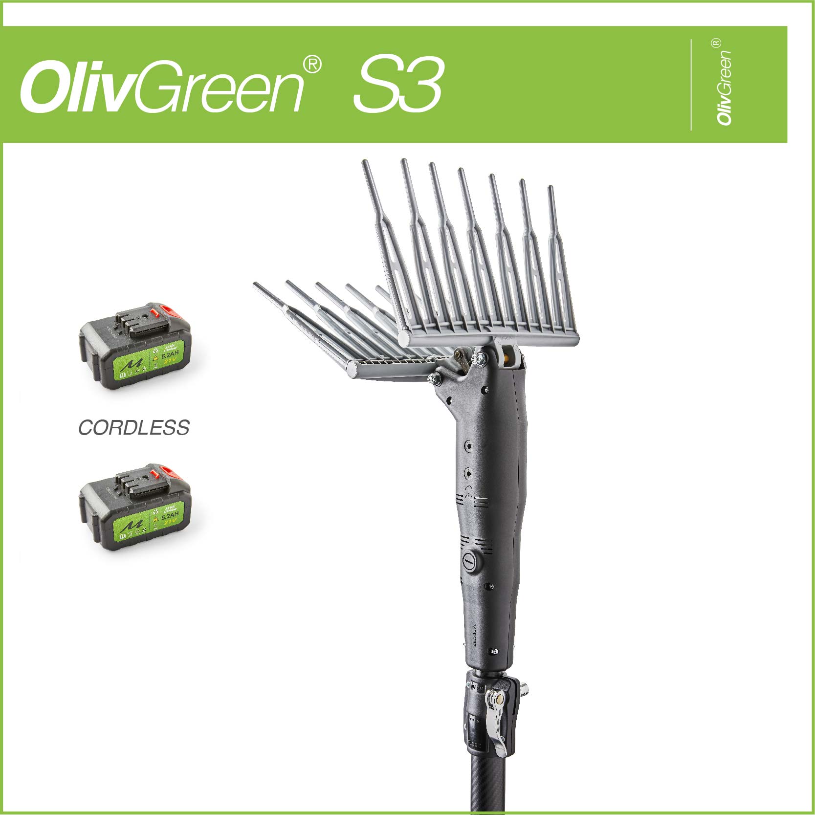 FEATURES: The Olivgreen S3 cordless olive harvester is designed to satisfy the olive harvest. It is a machine suitable for small and medium pruned plots of medium vegetation. The motion and shape of the rakes allow excellent harvests on all olive varieties. Equipped with a telescopic rod and relative locking system, it is operated by a 21V motor with replaceable brushes + gear motor controlled by an ON / OFF switch on the handle and equipped with a safety system.