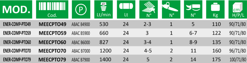 FEATURES: The PTO compressor extends the MINELLI’s professional range. It is used by joining it directly to the tractor connection. It is available in several sizes of ABAC pumps. It is fitted with 24l capacity tank, equipped with a FR + L METAL WORK unit, clean air intake, safety valve, check valve and belt drive with drive shaft of 1’’3 / 8 Z6.