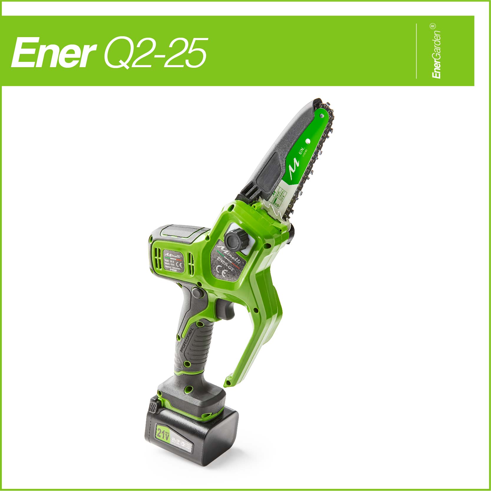 CARATTERISTICHE: L’EnerQ2-25 è un leggero, ergonomico e maneggevole potatore cordless a batteria dotato di motorizzazione BRUSHLESS, lubrificazione automatica, serbatoio olio, barra da 6” e catena da 1.1 – 1/4 ideale per la manutenzione del verde e arbusti.