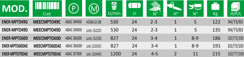 CARATTERISTICHE EnerMotor PTO: Questa macchina professionale unisce le caratteristiche di un motocompressore alla comodità del trasportare lo stesso utilizzando l’attacco tre punti o l’attacco traino del trattore. La macchina può essere realizzata in varie configurazioni, con motore BENZINA o DIESEL, con o senza carrello e scegliere fra due  capacità di serbatoio aria. La versione benzina monta un motore HONDA, quelle diesel motori KOHLER. Le capacità del serbatoio varia dai 24 Lt ai 48 Lt. Le testate sono ABAC. Di serie sono i gruppi ‘‘FR + L’’  METAL WORK, l’acceleratore automatico e doppio perno supporto avvolgitore.